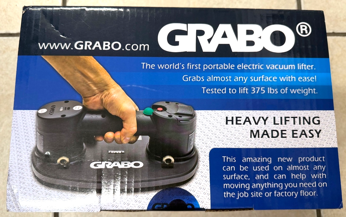 The page sells the Grabo Cordless Powered Vacuum Suction Cup Lifter, which is the monitored product under the GRABO brand. The product name matches, and it is offered for sale on the page.